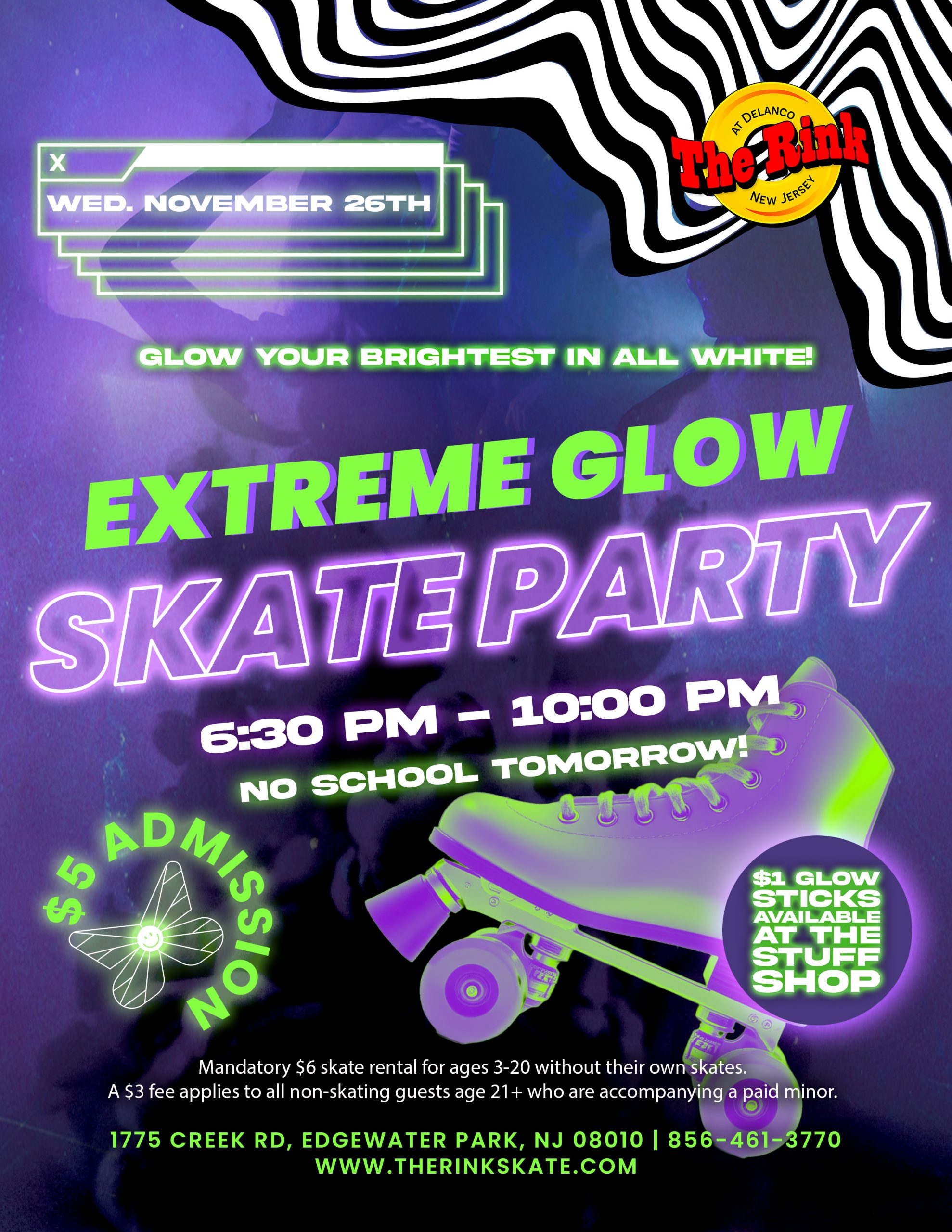 🌟🛼 Extreme Glow Skate Party – Wednesday, Nov 26th, 2025! ✨💡 No school, no problem! Get ready to glow your brightest and skate the night away at our Extreme Glow...