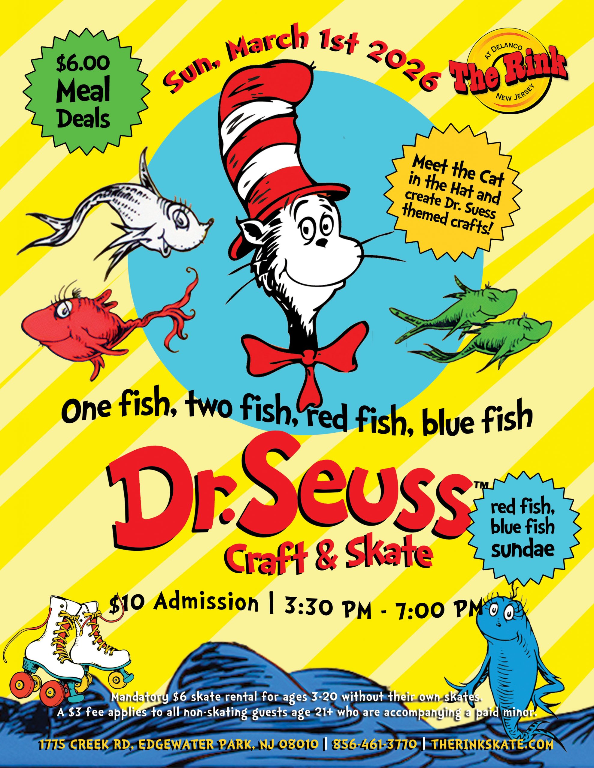 🐟🛼 One Fish, Two Fish, Red Fish, Blue Fish Craft & Skate – Sunday, March 1st, 2026! 🎩✨ Celebrate the whimsical world of Cat in the Hat with a fun-filled...