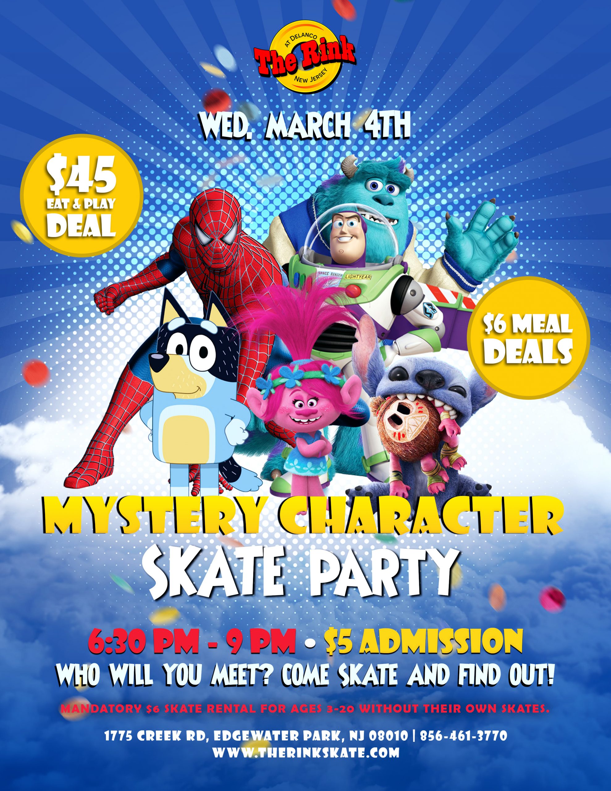 🎭🛼 Mystery Character Skate Party – Wednesday, March 4th, 2026! ✨ Who will you meet on the skate floor? 👀 Roll through and find out! 📅 Wednesday, March 4, 2026⏰...